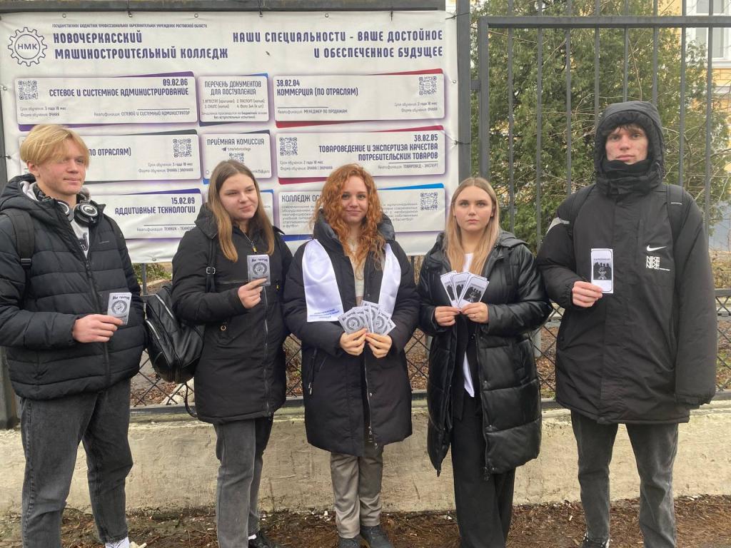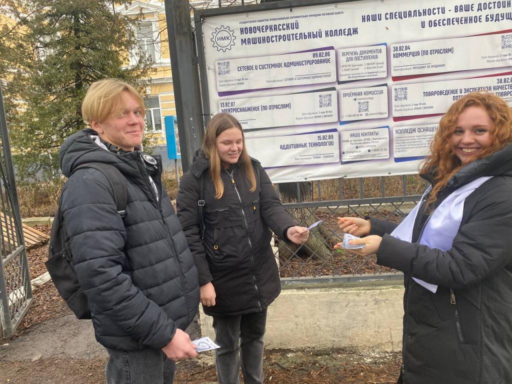 Студенты-волонтеры Новочеркасского машиностроительного колледжа 20 декабря вышли на улицы и провели антинаркотическую акцию «Нет наркотикам», с целью пропаганды здорового образа жизни. Ребята раздали прохожим листовки и буклеты по профилактике наркомании, а также призвали молодежь, опираясь на активную жизненную позицию, живое общение со сверстниками, выбирать жизнь, беречь свое здоровье, вести здоровый образ жизни, учиться противостоять трудностям и в трудных жизненных ситуациях уметь пользоваться «Телефонами доверия».