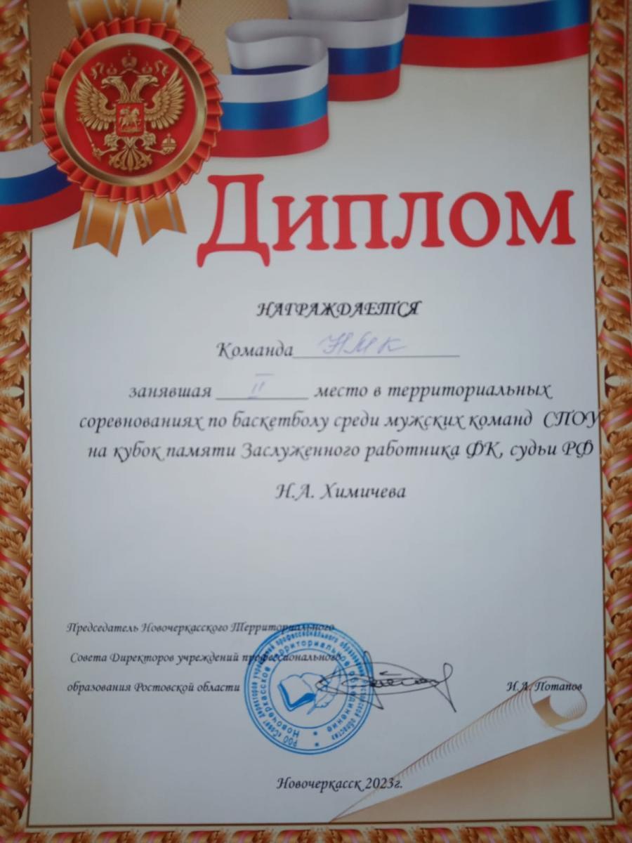 26 января команда баскетболистов Новочеркасского машиностроительного колледжа приняла участие в территориальных соревнованиях по баскетболу среди мужских команд СПОУ на кубок памяти заслуженного работника ФК Н. А. Химичева, проходивших на базе нашего колледжа.