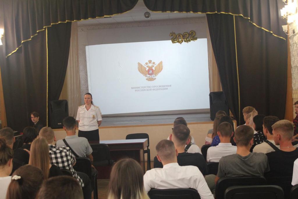 Традиционно 1 сентября с информационной беседой, перед студентами 1-4 курсов выступила инспектор ПДН ОП-1 МУ МВД РФ «Новочеркасское» старший лейтенант полиции Лебедева Юлия Сергеевна. Во время беседы, были затронуты темы охраны жизни и здоровья, профилактики противоправного поведения и экстремистских проявлений, мерах личной безопасности, недопустимости употребления алкоголя, наркотических и психотропных веществ, уголовной и административной ответственности несовершеннолетних, антитеррористической защищенности мест общего пользования, правилах ПДД, недопустимости попыток суицида.