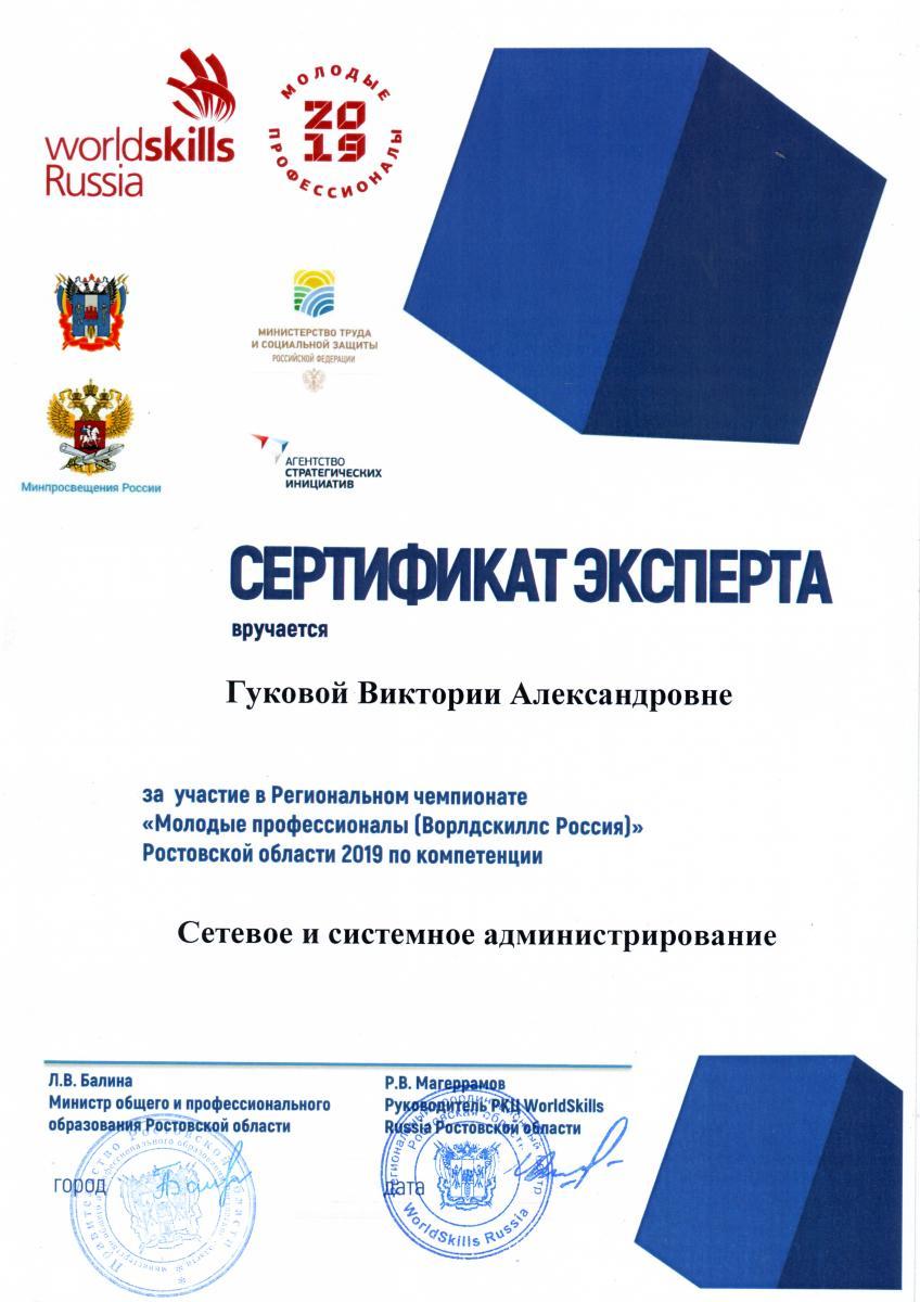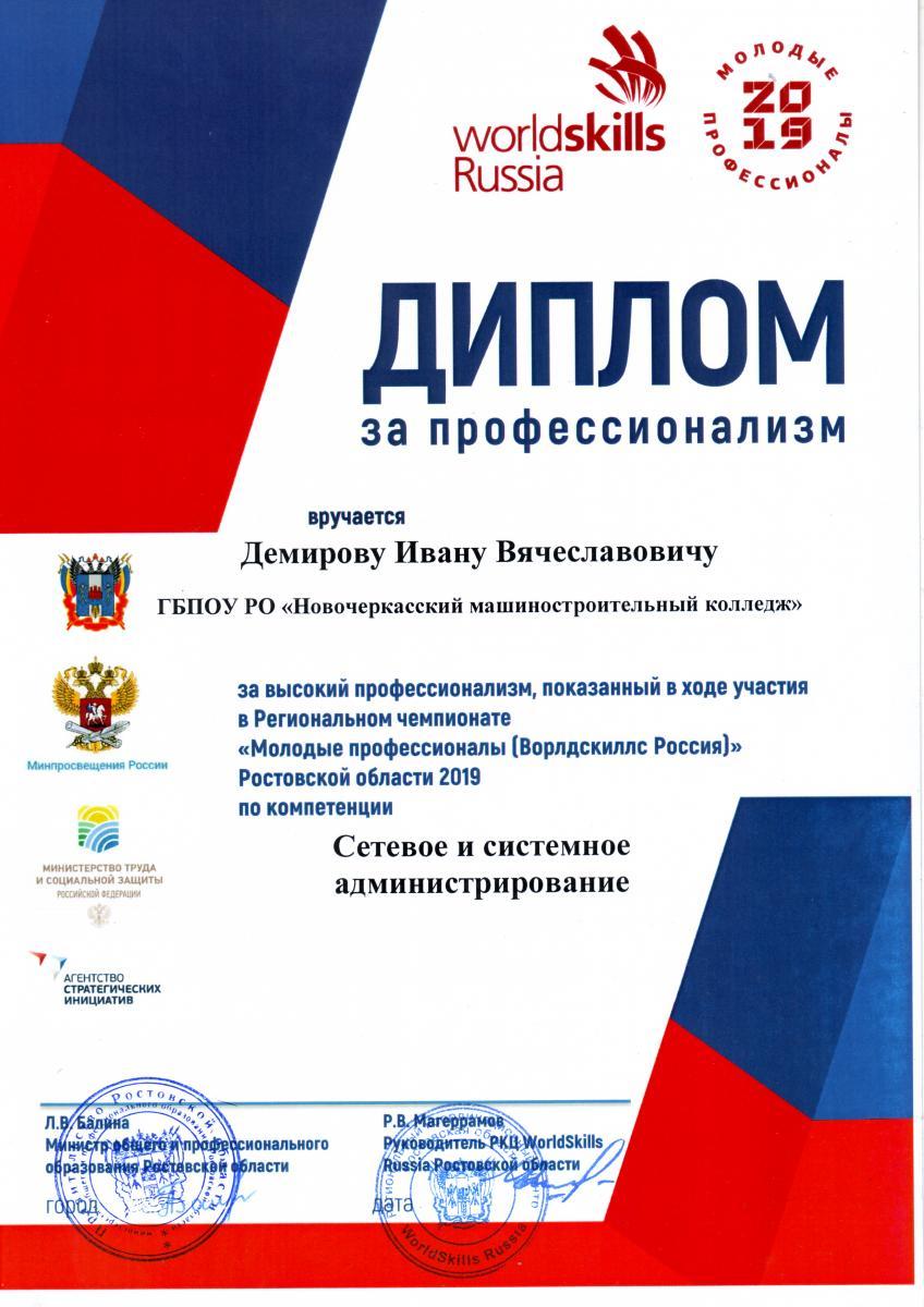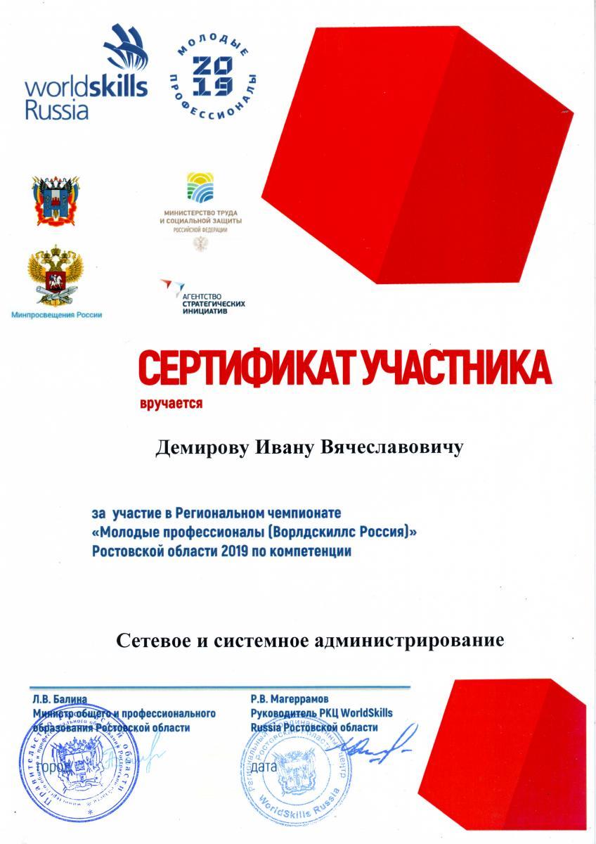 - "Сетевое и системное администрирование" (площадка  ГБПОУ РО «Ростовский-на-Дону колледж связи и информатики»): участник Демиров Иван Вячеславович, эксперт Гукова Виктория Александровна;