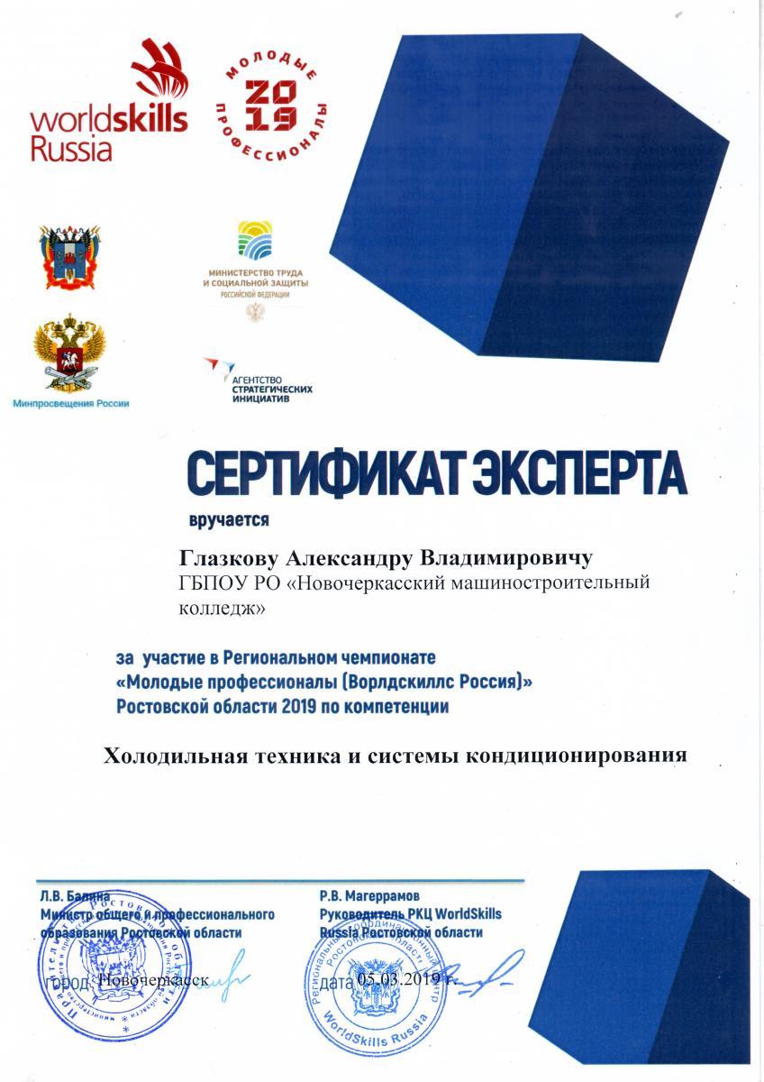 - "Холодильная техника и системы кондиционирования" (площадка  ГБПОУ РО «Новочеркасский колледж промышленных технологий и управления»): участник Сенченко Роман Николаевич, эксперт Глазков Александр Владимирович.