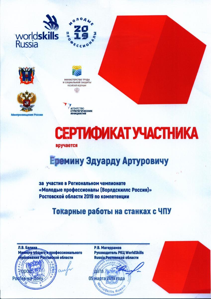 - "Токарные работы на станках с ЧПУ" (площадка  ГАПОУ РО «Ростовский колледж технологий машиностроения»): участник Еремин Эдуард Артурович, эксперт Ивлиева Ольга Владимировна;