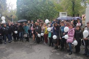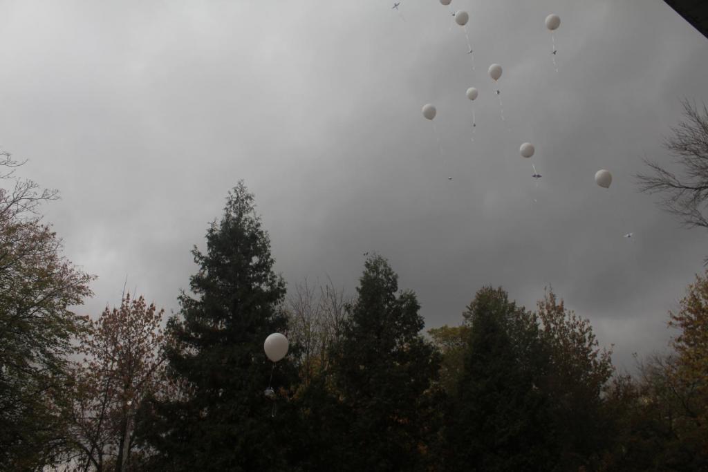 Мероприятие завершилось флэшмобом: в осеннее небо были выпущены белые шары, несущие бумажных журавликов, олицетворяющих души погибших.