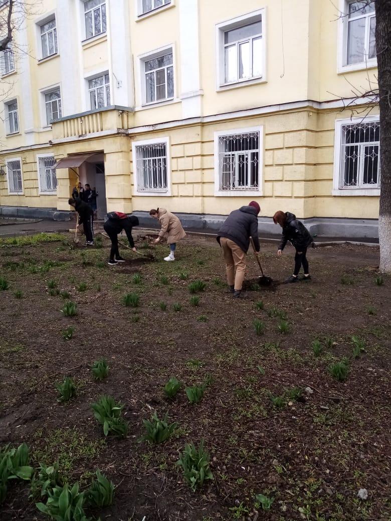 Перед зданием нашего общежития на проспекте Баклановском, студенты Новочеркасского машиностроительного колледжа сегодня посадили деревья, вишни, мини-груши и красивую, ароматную сирень.