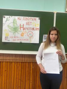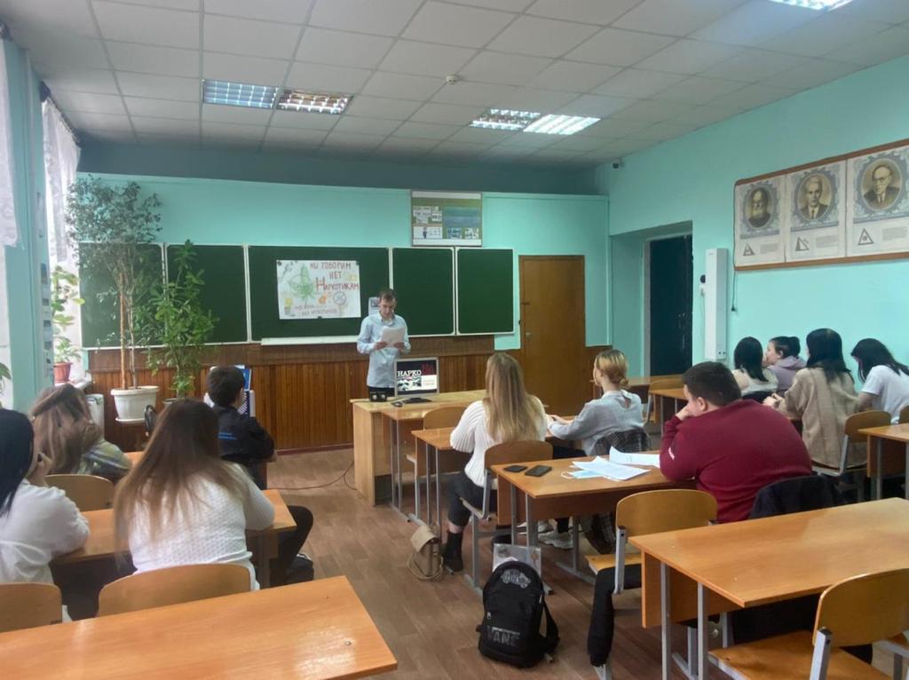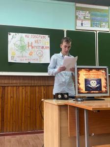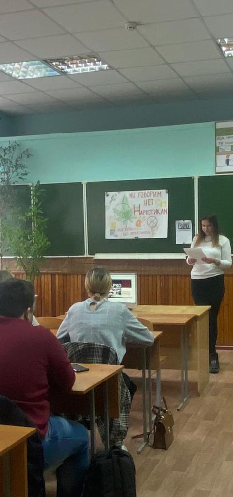 В ходе урока студентам была показана презентация, а так же Касьянова Алина и Белослудцев Вадим выступили с докладами по темам «Моя жизнь без наркотиков» и «Мы говорим наркотикам - нет!»