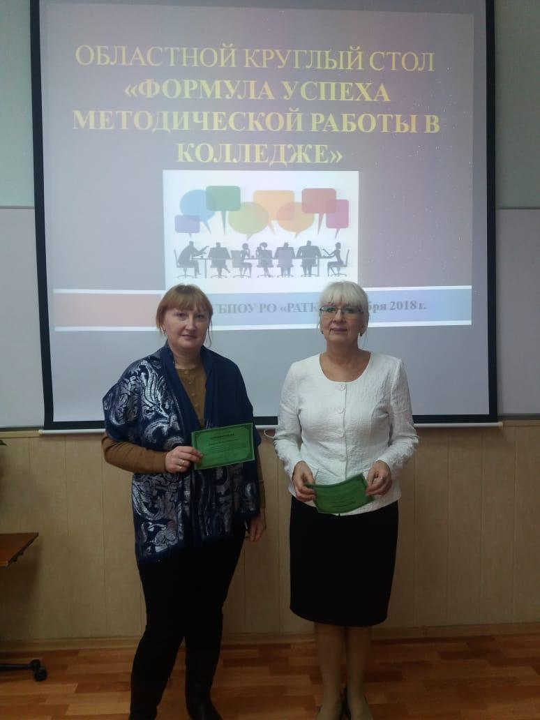 28 ноября 2018 в ГБПОУ РО "РАТК" проводился областной круглый стол "Формула успеха методической работы в колледже". В нем от нашего колеллджа приняли участие зам. лиректора по УР Петрова О.В. и старший методист Сизякина Э.В.