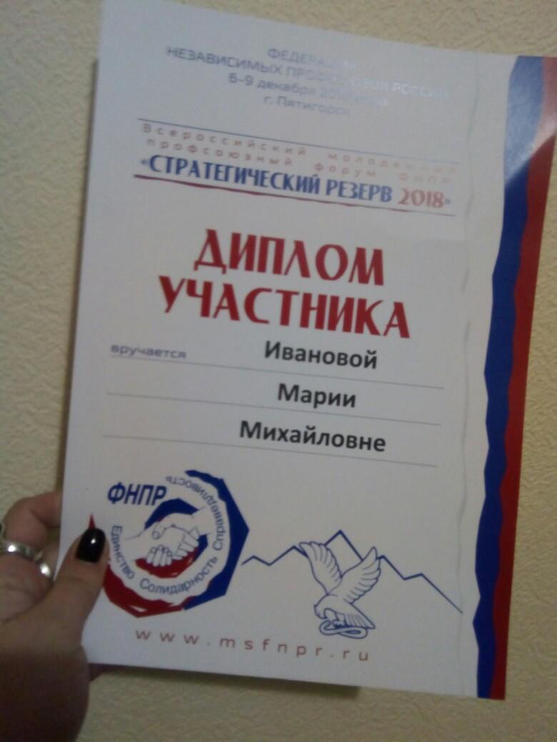 6-9 декабря 2018 года в г. Пятигорске прошел Всероссийский молодежный профсоюзный форум ФНПР «Стратегический резерв 2018». В числе участников форума была представитель нашего колледжа педагог-организатор Иванова Мира Михайловна.