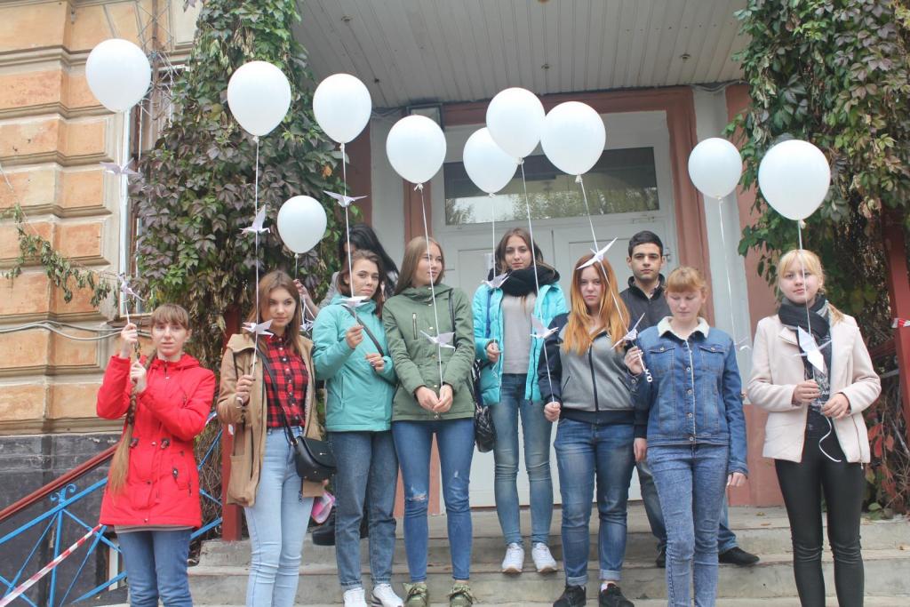 Завершилось мероприятие флэш-мобом: студенты вышли во двор колледжа и выпустили в небо белые шары с бумажными журавликами.