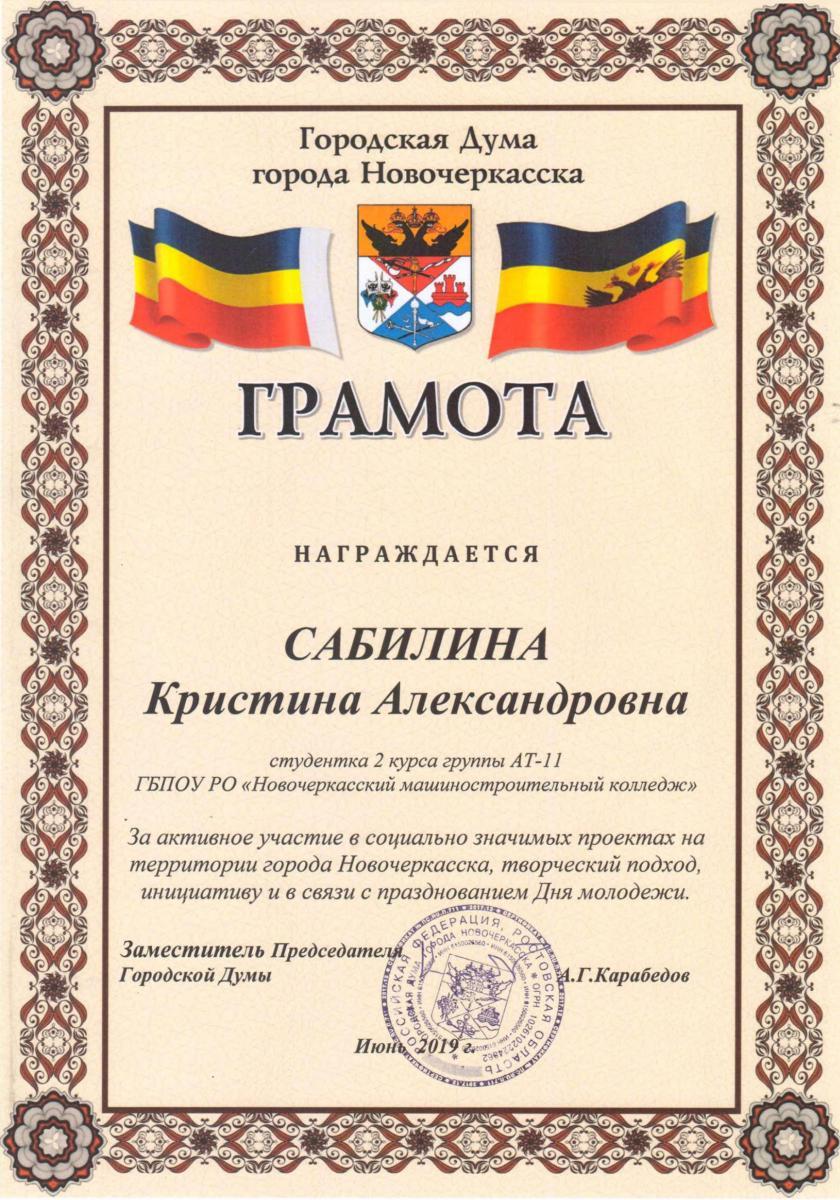 14 благодарностей подготовили Администрация и городская дума Новочеркасска, две из которых получили студентки нашего колледжа Сухова Татьяна (ТК-31) и Сабилина