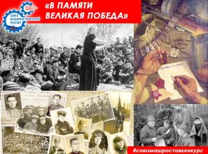 В рамках проекта «В памяти Великая Победа», инициатором которого является Союз Машиностроителей России, объявляется одноименный творческий конкурс в номинациях – «Рисунок», «Пост в соцсети», «Стихи», «Песни», «Фото».
