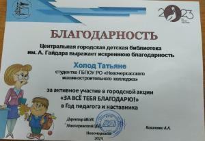 Студенты Новочеркасского машиностроительного колледжа Татьяна Холод студентка группы АТ-42, Артем Перепечаев студент группы Э-21 и преподаватель колледжа Александр Владимирович Глазков приняли активное участие в городской акции и были награждены благодарностями, а также ценными призами.